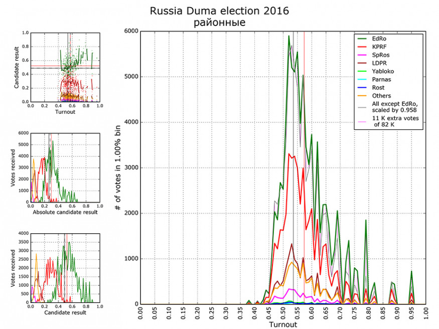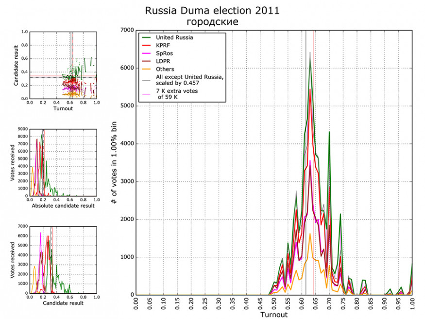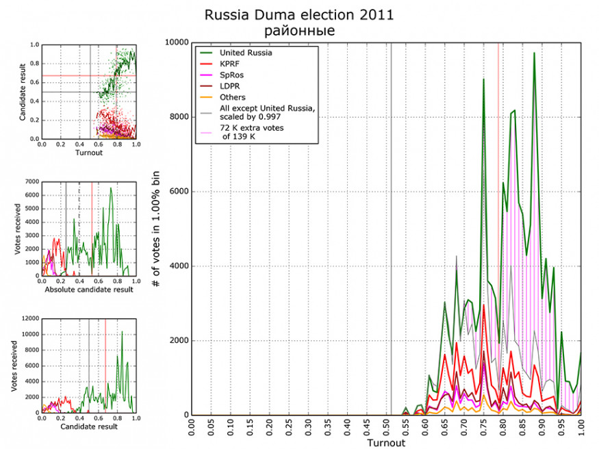 В 2011-м в городах все прилично (хотя на нескольких участках нарисовали явку ровно в 70%), а на части районных участков активно рисовали.