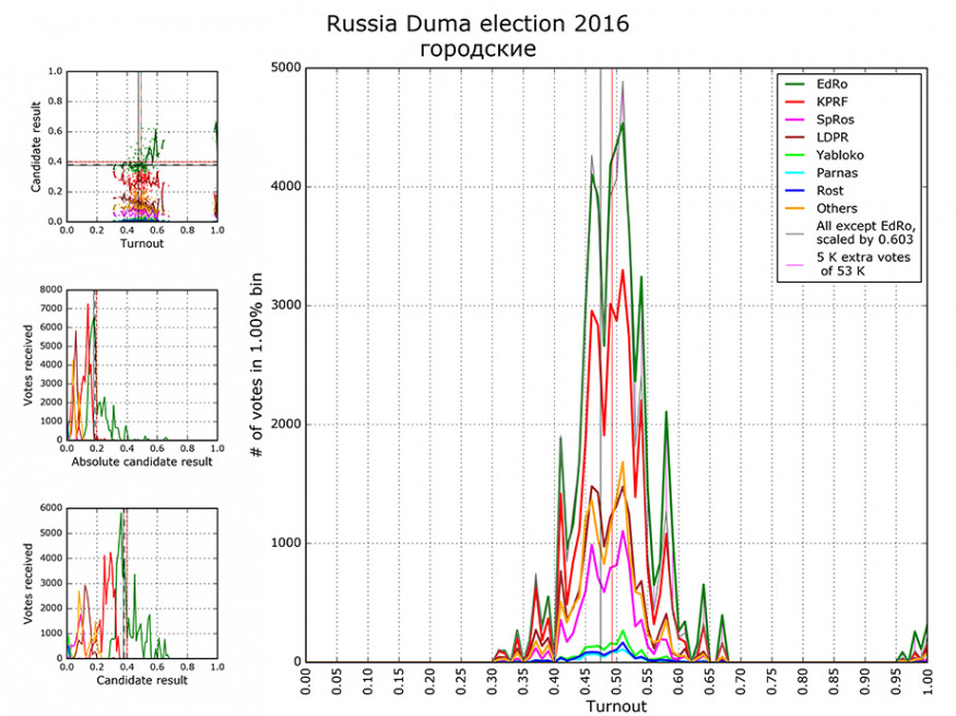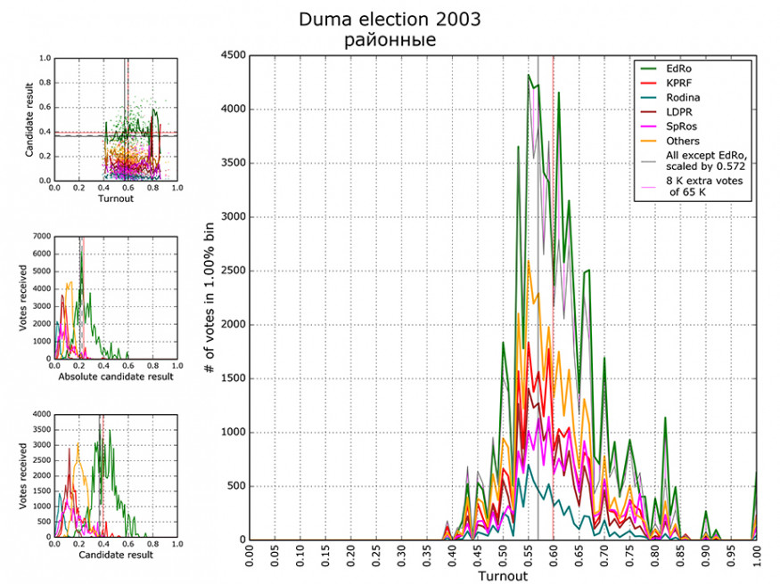 Заштрихованная область гистограммы показывает, как при росте явки растет количество голосов за лидирующего кандидата или партию. Если при явке в 60 или 75% соблюдаются определенные пропорции в голосовании за кандидата (партию), то начиная с 80% эта пропорция нарушается: число голосов, поданных за «неосновного» кандидата (партию) не меняется, а за лидера (партию власти) — возрастает. Если на гистограмме появляется такая подозрительная область, это говорит о том, что во время выборов происходили какие-то манипуляции для достижения нужного результата.