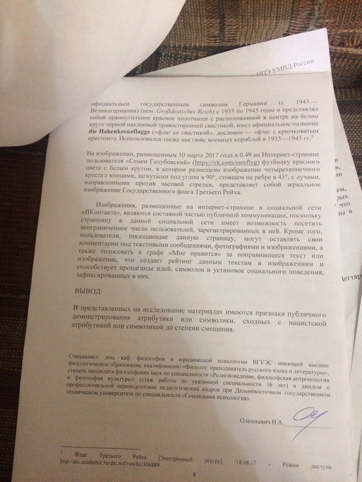 16-летнего ученика одиннадцатого класса лицея №41 Владивостока Семена Голубовского обвиняют по статье 20.3 КОАП "Публичное демонстрирование нацистской символики" за рисунок на странице в “ВКонтакте”. Школьник сохранил в архиве, доступном только для "друзей" и "друзей друзей", изображение человека в футболке с левосторонней свастикой, буддистским символом совершенства.