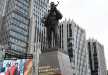 Памятник Калашникову открыт в Москве на пересечении улиц Садовая-Каретная и Долгоруковская в День оружейника по инициативе Российского военно-исторического общества и госкорпорации "Ростех", сообщает Интерфакс. Композиция скульптора Салавата Щербакова включает пятиметровую фигуру Калашникова, стоящего с автоматом в руках на четырехметровом постаменте. На заднем фоне монумента расположена скульптурная композиция с фигурой Михаила Архангела.