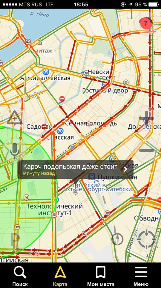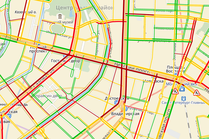 Вечером 21 сентября в центре Петербурга образовалась пробка. Стоят Невский проспект, Садовая улица, Литейный проспект, улица Марата.