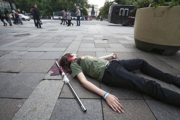 Короткий лежал на брусчатке на тротуаре, изображая пострадавшего. Рядом с ним положили трубу, завернутую в газету, а на голову налили свекольный сок, который имитировал кровь, передает «Медиазона».