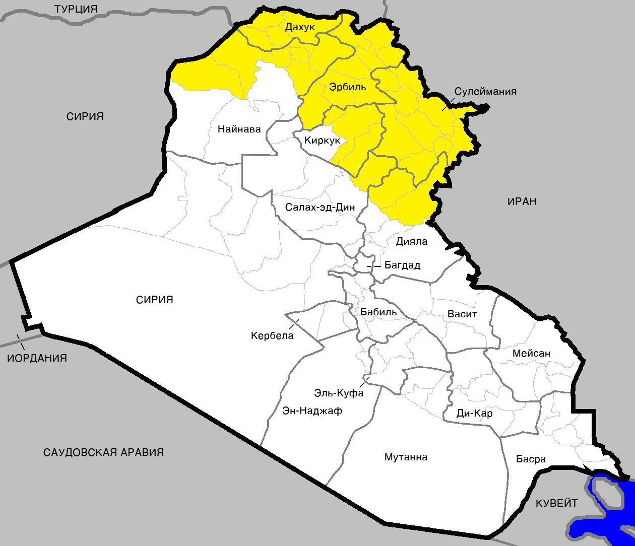 *Карта Ирака. Желтым выделена территория курдской автономии.*Источник: google.com