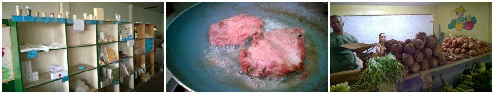 Слева направо: Государственный магазин — бодЕга — на 26-й улице в Ведадо, Гавана; праздничный ужин — бистЕки из свинины; овощной рынок — Агро — возле остановки «Зоопарк» в ВедадоФото: из личного архива В то же время, когда заканчиваются продукты, приобретенные по талонам — а происходит это очень быстро — кубинцу приходится покупать базовые товары за полную цену. То есть, скажем, по либрете он взял свой рис, пять фунтов на 1,25 песо. Дальше, когда рис уже закончился, а месяц еще нет, приходится покупать за обычную цену — четыре песо за фунт.