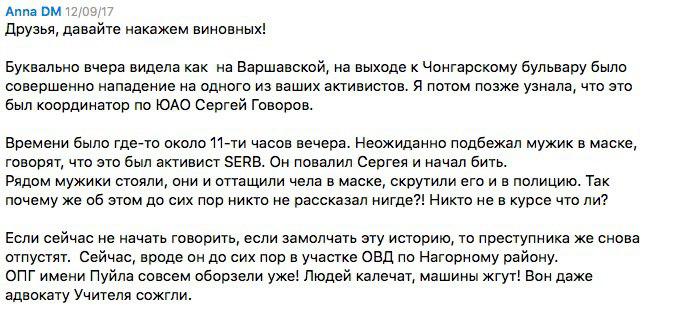 «Буквально вчера видела как на Варшавской, на выходе к Чонгарскому бульвару было совершенно нападение на одного из ваших активистов. Я потом позже узнала, что это был координатор по ЮАО Сергей Говоров. Времени было где-то около 11-ти часов вечера. Неожиданно подбежал мужик в маске, говорят, что это был активист SERB. Он повалил Сергея и начал бить. Рядом мужики стояли, они и оттащили чела в маске, скрутили его и в полицию. Так почему же об этом до сих пор никто не рассказал нигде?! Никто не в курсе что ли? Если сейчас не начать говорить, если замолчать эту историю, то преступника же снова отпустят. Сейчас, вроде он до сих пор в участке ОВД по Нагорному району», — писала Anna DM.