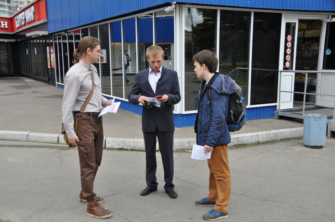 25 августа. Биг Ланч (в центре) разговаривает с агитаторами у метро «Чертановская». Фото предоставлено штабом Навального.