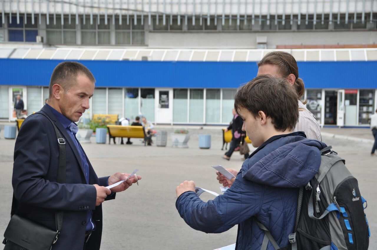 25 августа. Алексей Щербаков (слева) разговаривает с агитаторами у метро «Чертановская». Фото предоставлено штабом Навального.