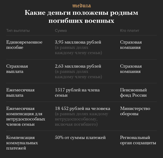 Разночтения между «умер» и «погиб» — не единственный стилистический момент, который может влиять на размер или сам факт получения государственных компенсаций. Например, пенсии по потере кормильца (это еще один тип выплат) зависят от заключений военно-врачебных комиссий и конкретно — от того, какая в них указана причина смерти. «Военная травма» и «заболевание, полученное в период военной службы» означают разные суммы пенсий; «Медузе» известны случаи, когда из-за отсутствия записи о военной травме родственникам погибших солдат отказывали и в ежемесячной компенсации, положенной по закону.