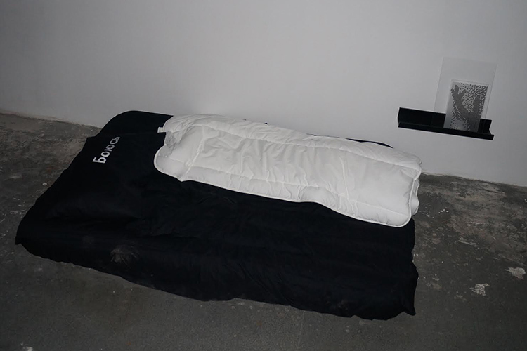 Многочастный проект «Боюсь» Александра Образумова в Екатеринбурге представлен повторением его выставки «Под прикрытием», которая прошла в 2016 году в галерее «Богородское». Художник любит говорить о ритуалах и страхах. В данном случае вторая тема явно преобладает. В темной комнате можно увидеть, если приглядеться, и число 13, и бутылку, лежащую на полочке так, что она вот-вот упадет, и лежанку, на которой написано заветное кредо параноика (не буду цитировать надоевшего всем Бродского, и так все понятно). Это язык сегодняшних фобий, который также трансформировался под влиянием реалий настоящего, будь то интернет или корпоративная культура.