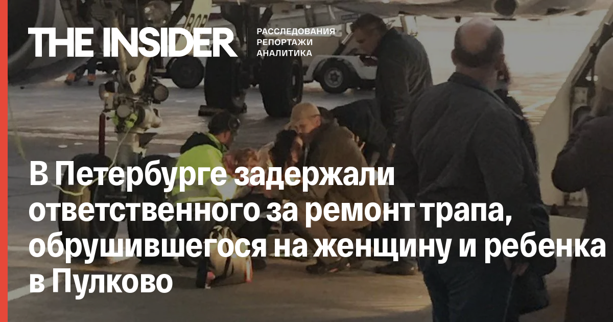 В Санкт-Петербурге задержан начальник участка механических работ службы спецтранспорта ООО «Воздушные Ворота Северной Столицы». Он являлся ответственным за ремонт трапа в аэропорту Пулково, который обрушился под женщиной с полуторагодовалой внучкой.