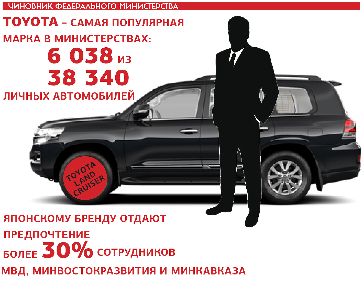 Самой популярной маркой автомобиля среди всех ведомств оказалась Toyota (6 038 авто из 38 340). На этой машине передвигаются 5 542 чиновника и членов их семей. Японскому бренду отдают предпочтение более 30% госслужащих МВД, Минвостокразвития и Минкавказа — в этих министерствах он особенно востребован в качестве личного транспортного средства.