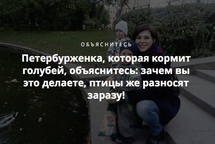 Конечно, я знаю, что птицы — а в особенности голуби — разносят заразу. Я понимаю, что нужно быть более осторожной, и не разрешаю никого в руки брать, подбирать их перья и вообще как-либо контактировать с уличными птицами и животными. Но побегать за ними, посмотреть на них и покормить, чтобы ребенок повеселился, разрешаю.