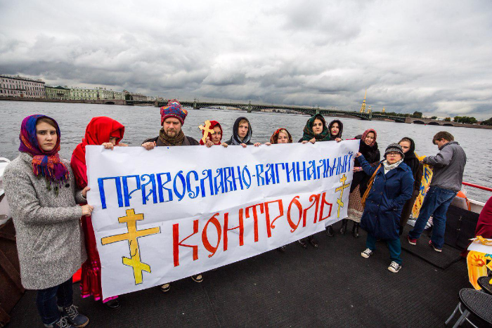 В воскресенье, 1 октября, в Петербурге прошел водный «крестный ход» против онанизма. Активисты проплыли на теплоходе по рекам и каналам с плакатами «Женщина должна рожать, а не думать» и «Бог терпел и нам велел».