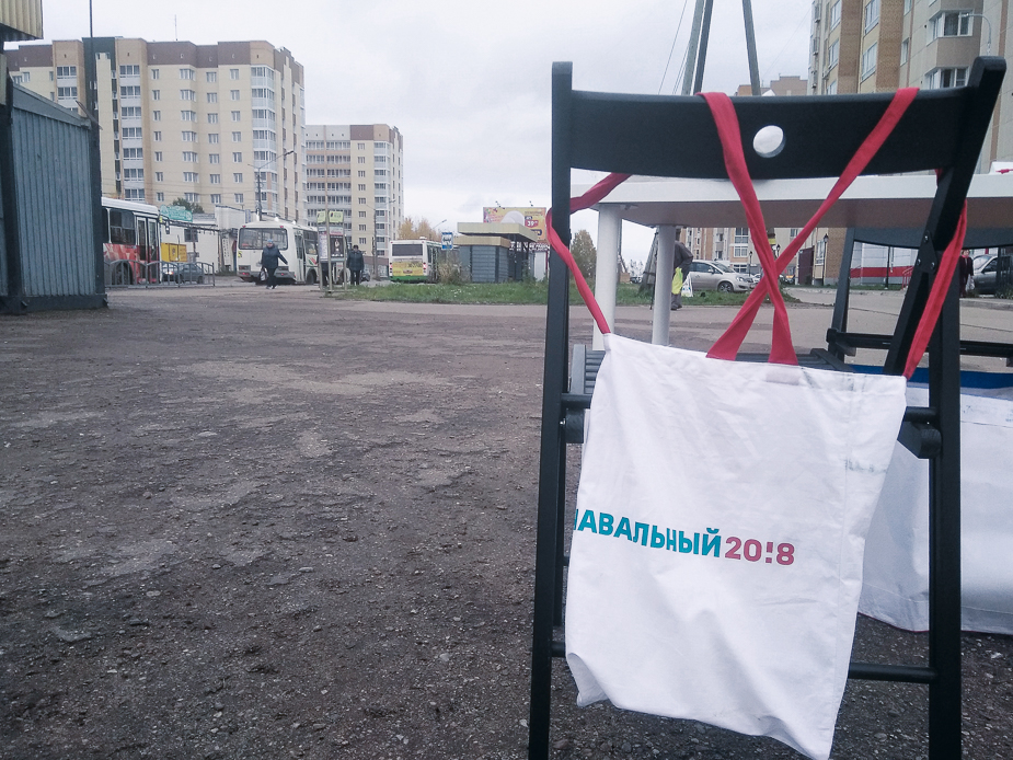Воскресенье, четыре часа дня. Трое сторонников Алексея Навального — Анатолий Мишарин, Людмила Вяткина и Олег Боровенков — уже два часа раздают агитационную продукцию и общаются с прохожими. На небольшом пятачке между недавно построенной церковью и проезжей частью стоит стол, на нем разложены календари, газеты и наклейки. Неподалеку припаркована старенькая «Лада» с надписью «НАВАЛЬНЫЙ 20!8» на заднем стекле. Чуть дальше стоит полицейская машина, из которой двое мужчин наблюдают за происходящим. Поговорить о Навальном и о будущем страны останавливается небольшая группа подростков. «Только не фотографируйте нас!» — кричат они.