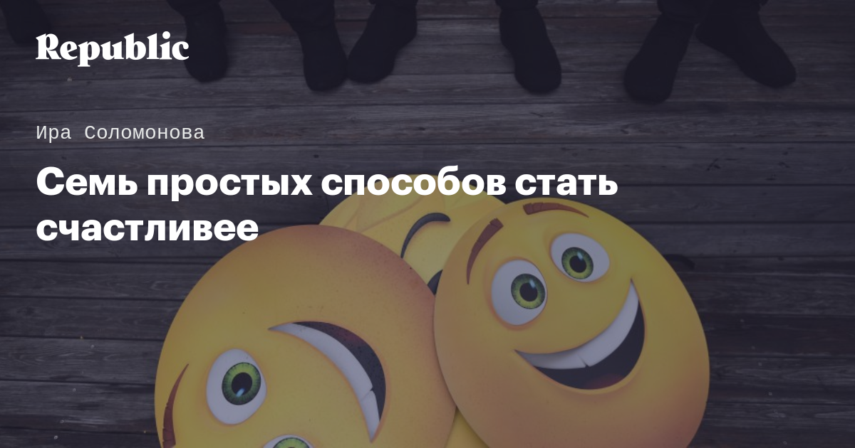 Судя по последним опросам, в России очень много счастливых людей – порядка 85%, если верить ВЦИОМ. Правда, зарубежные исследователи оценивают уровень счастья россиян не так высоко. Согласно World Happiness Report, Россия по этому показателю занимает 49-е место из 155. В этом рейтинге учитываются доля ВВП на душу населения, уровень социальной защищенности, продолжительность жизни, свобода выбора и другие показатели. Можно спорить, считать ли достижение личного счастья смыслом жизни или ее приятным побочным продуктом, но стремление к нему – врожденная черта человека. Republic изучил, какие советы по достижению счастья дают психологи, ученые, предприниматели и просто люди, считающие себя счастливыми.