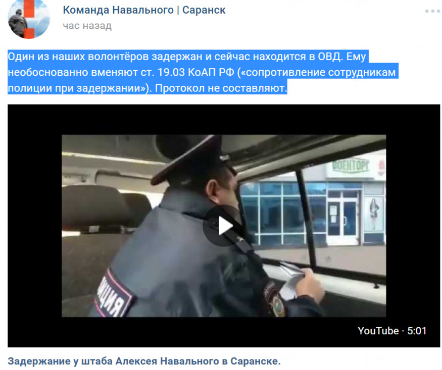 После завершения прогулки на странице группы штаба Навального в Саранске появилось сообщение, что задержали одного из волонтеров штаба.