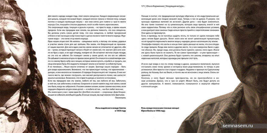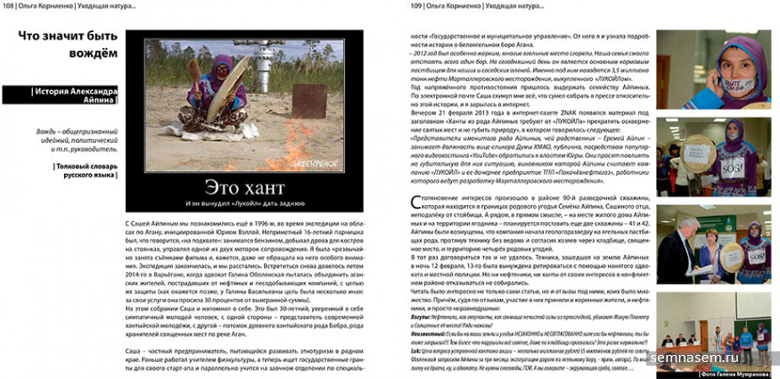 — Ханты сильно страдают от нефтяного загрязнения, эти люди, живущие на отделенных северных территориях, стали единственными, кого беспокоит состояние окружающей среды, потому что это касается их напрямую. Книга наполнена голосами живых людей и тех, кто уже ушел. Книга дает возможность узнать личные судьбы и попробовать понять, что мы живем в одной стране и как нам вместе искать пути взаимодействия.