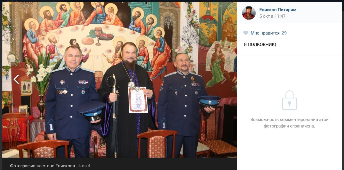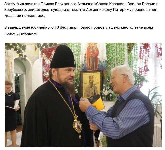 В то же время, архиепископ Питирим (Волочков П.П.) принимает военный казачий чин вместе с оружием, в нарушении правил и догматики РПЦ МП, тем самым перестает быть священником и монахом, cам себя называет полковником!