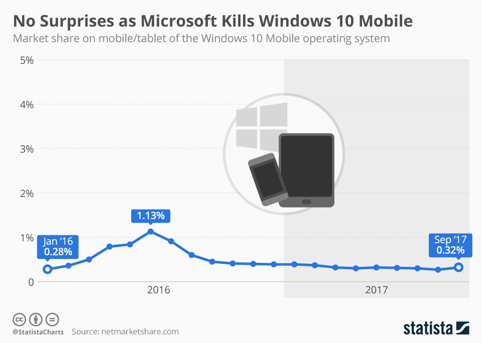 Вице-президент Microsoft Джо Белфиор, отвечающий за операционные системы, признал, что корпорация больше не будет развивать свою операционную систему для мобильных устройств Windows Phone. Ни сам он, ни Билл Гейтс уже не пользуются телефоном на Windows. Пользователей слишком мало, инвестировать в платформу больше нет смысла, написал Белфиор в своем Twitter. Вот картинка в подтверждение его слов: