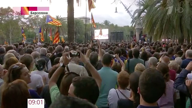 Сторонники отделения Каталонии от Испании собрались у здания парламента. Фото: скриншот с видео 1tv.ru
