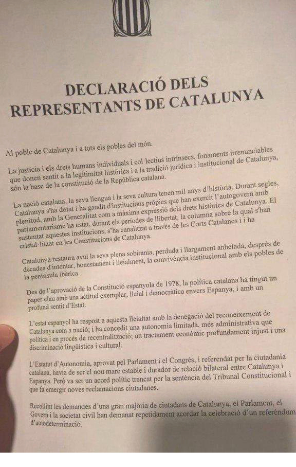 Поздно вечером 10 октября глава Женералитата (правительства) Каталонии Карлес Пучдемон подписал под аплодисменты депутатов каталонского парламента Декларацию о независимости региона от Испании. Документ состоит из 4 страниц, на 3-й черным по белому написано, что парламент провозглашает Каталонскую республику. После этого все спели гимн Каталонии и разошлись. Народ, который за три часа до того плотным кольцом окружал здание парламента, перекрытое со всех сторон региональной полицией Mossos d’Esquadra, уже почти разошелся. Почти разъехались и каталонские крестьяне, подогнавшие сюда в знак поддержки парламента свои трактора — наблюдатели насчитали их здесь до 20 единиц. Люди ушли расстроенные, исчерпав лимит ожиданий: в своей речи, которую он начал с часовым опозданием — по Барселоне стремительно расползлись слухи, что оно было вызвано двумя срочными телефонными разговорами — с генсеком ООН Антониу Гутерришем и главой Еврокомиссии Жаном-Клодом Юнкером, — Пучдемон не объявил ни о провозглашении независимости, ни об официально принятии Декларации о ней же. Скорее даже наоборот, пожурив испанские власти за политику «рецентрализации», проводимую в последние несколько лет, Пучдемон высказался за переговорный процесс с Мадридом и предложил депутатам ввести мораторий на имплементацию положений Декларации. 1200 журналистов со всего мира, собравшиеся в здании парламента, начали строчить срочные депеши: «Провозглашения независимости не произошло», «Каталония выбрала переговоры», «Сепаратисты разочарованы речью главы Женералитата». Потом начались прения. А еще примерно через час, как гром среди ясного неба, в Сети появились фотографии Пучдемона, подписывающего Декларацию и с некоторой хитрой надменностью смотрящего в этот момент в направленные на него объективы фотокамер: «Вот оно, свершилось, несмотря ни на что. Мы сделали это!» Это мгновение стало своего рода венцом драматического многочасового ожидания, в которое Каталония повергла 10 октября чуть ли не весь мир, причем с каждым часом градус тревоги поднимался.