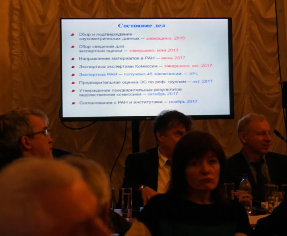 На заседании обсуждался вопрос, успеют ли экспертные советы в отделениях РАН представить свои экспертные заключения и рекомендации по каждому из институтов, чтобы закончить оценку уже в этом году. Главным итогом этой работы будет разделение всех академических организаций на три категории: первая – лидеры, вторая – «крепкие середняки», третья – отстающие.