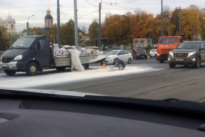 На мосту Александра Невского с грузовика упал мешок, из которого на проезжую часть высыпалась белая смесь. Фото опубликовали на портале «Мегаполис». Как пишет автор фотографий, в мешке был цемент. Пользователи также предположили, что содержимое — строительная смесь, а некоторые посчитали это сахарным песком.