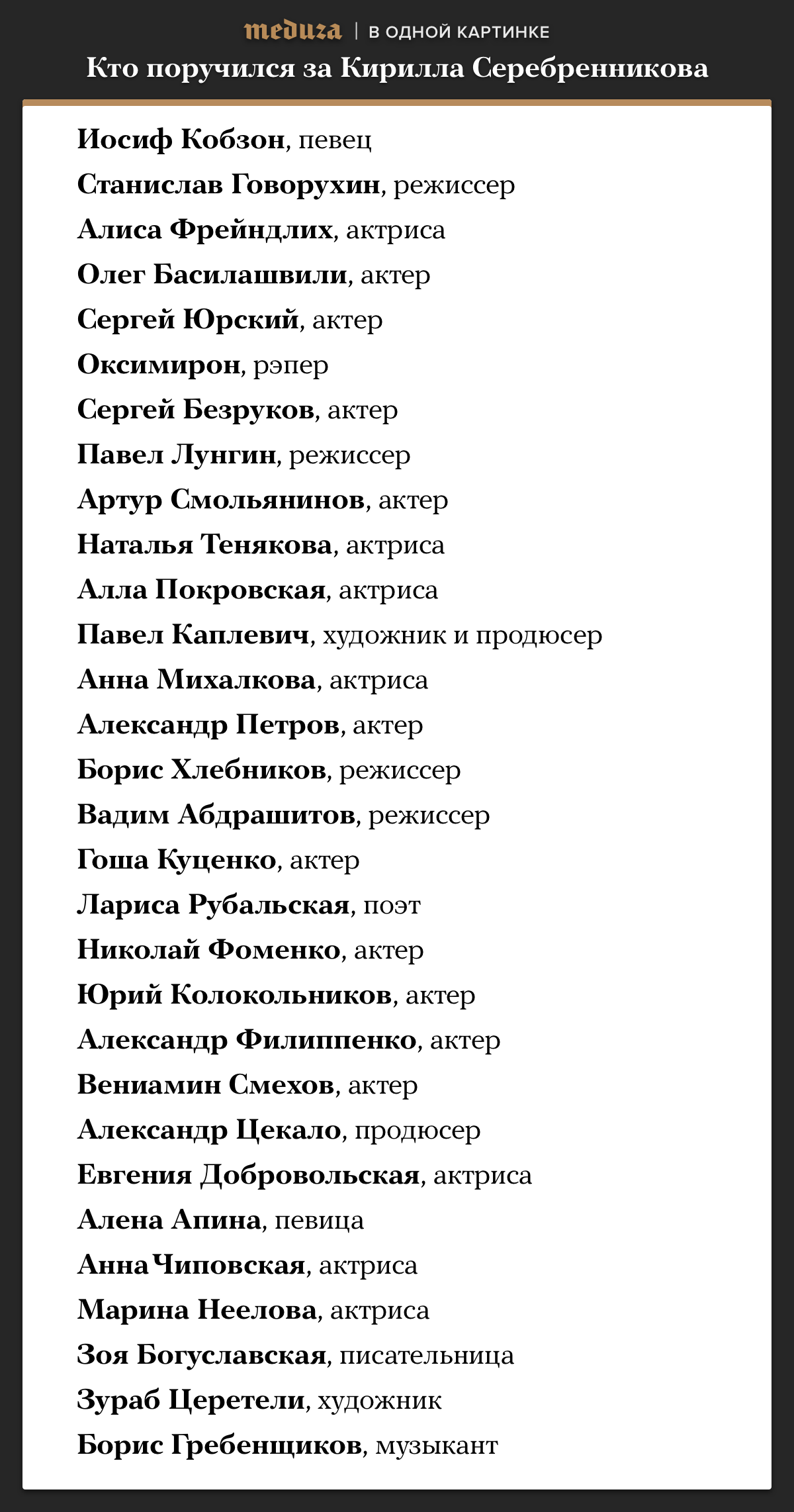 Поручительства 17 октября были представлены в Басманном суде Москве, где рассматривается вопрос о продлении домашнего ареста режиссера Кирилла Серебренникова. Ранее в московские суды поступили поручительства от 79 деятелей культуры.