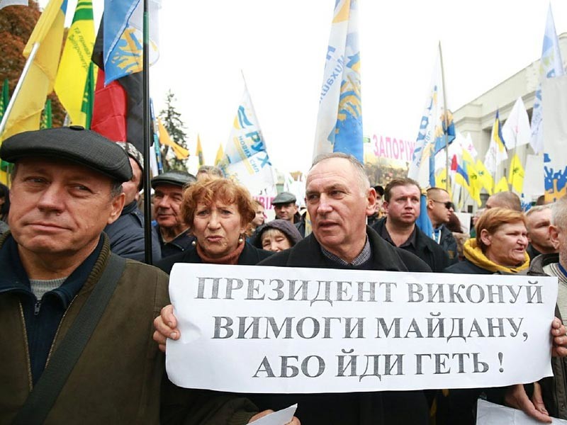 Митинг начался с исполнения гимна Украины. Участники демонстрации держат в руках флаги украинских националистических партий "Национальный корпус", созданного на базе нацбатальона "Азов", в отношении которого в России возбуждено уголовное дело, и "Свобода", а также партий "Рух нових сил", "Самопомощь", "Гражданская позиция". Среди собравшихся много людей в камуфляжной форме и пенсионеров.