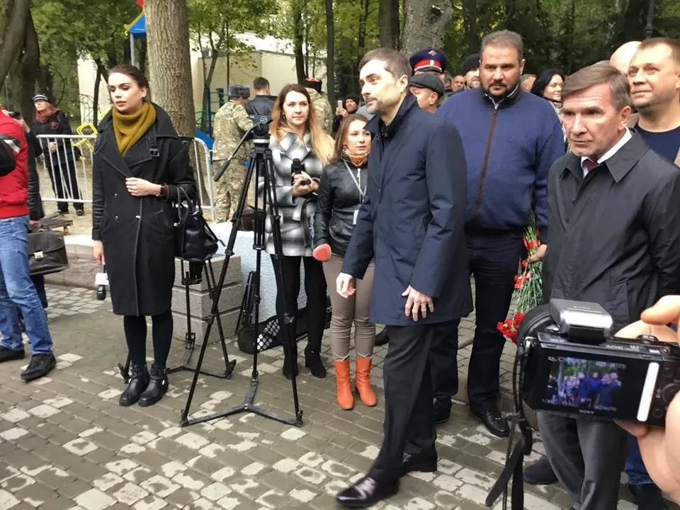 На открытии памятника присутствовали глава администрации Ростова-на-Дону Виталий Кушнарев и заместитель губернатора области Игорь Гуськов. Но настоящий ажиотаж вызвало появление помощника президента РФ Владислава Суркова. Владислав Юрьевич несколько минут пообщался с бывшими лидерами Донбасса и местными чиновниками, потом возложил красные гвоздики к монументу и, не сказав ни слова, покинул мероприятие.