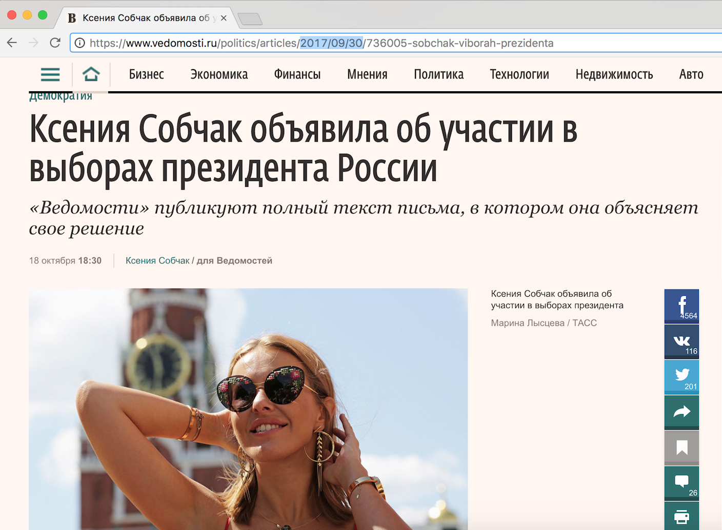 Обновлено в 19:17 Обращение Собчак в «Ведомостях», судя по URL-адресу статьи, было подготовлено к публикации еще 30 сентября. На это первым указал пользователь твиттера @eye_ii_eye.