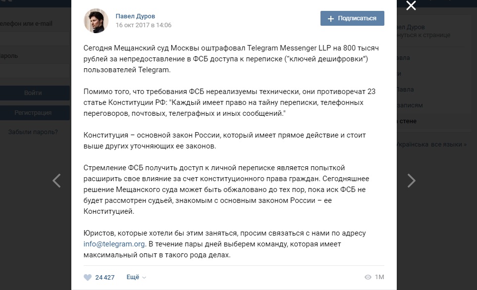 По словам Павла Дурова, требования ФСБ нарушают 23-ю статью Конституции России, по которой каждый человек имеет право на тайну переписки, телефонных переговоров, почтовых, телеграфных и иных сообщений. "Стремление ФСБ получить доступ к личной переписке является попыткой расширить свое влияние за счет конституционного права граждан", – написал Дуров. Он пообещал обжаловать решение Мещанского суда до тех пор, пока "иск ФСБ не будет рассмотрен судьей, знакомым с основным законом России – ее Конституцией".