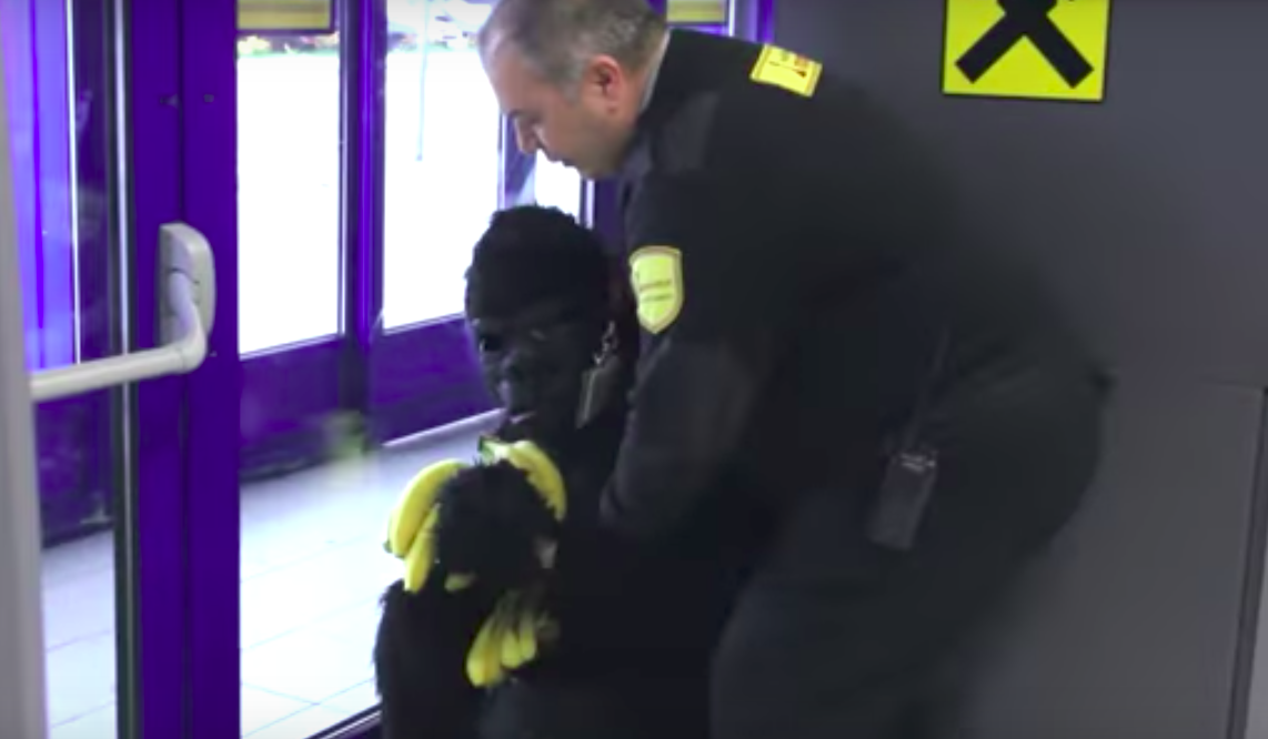 Пранкеры сняли видео про «гориллу», которая бегает по Петербургу. Она ворует бананы, пьет пиво и стоит на крыше Дома офицеров
