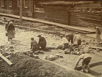 "Больше ста лет тому назад таким способом были замощены улицы в таких крупных городах, как Петербург и Лондон, а затем и в других городах Европы и Америки . Чаще всего мостили дороги чурками из леса - кругляка. Чурки подгоняли друг другу , сверху все засыпалось смесью глины и песка и получалась дорога с твердым покрытием. В крупных городах улицы мостили шестиугольными и прямоугольными чурками из дерева.