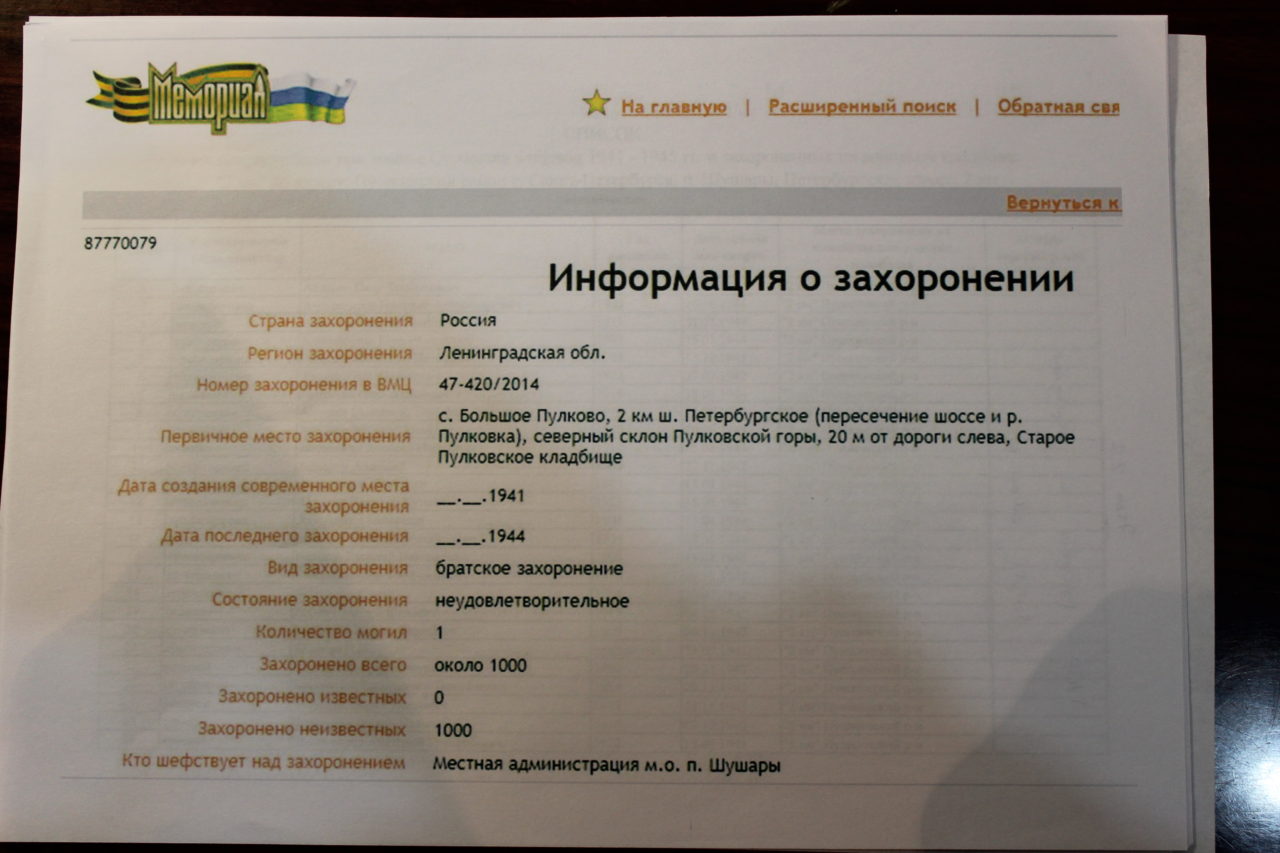 Паспорт захороненияФото: Фото: Александр Кробач Скробач также сообщил, что администрация Пушкина заявила, что не смогла найти вышеупомянутые документы.