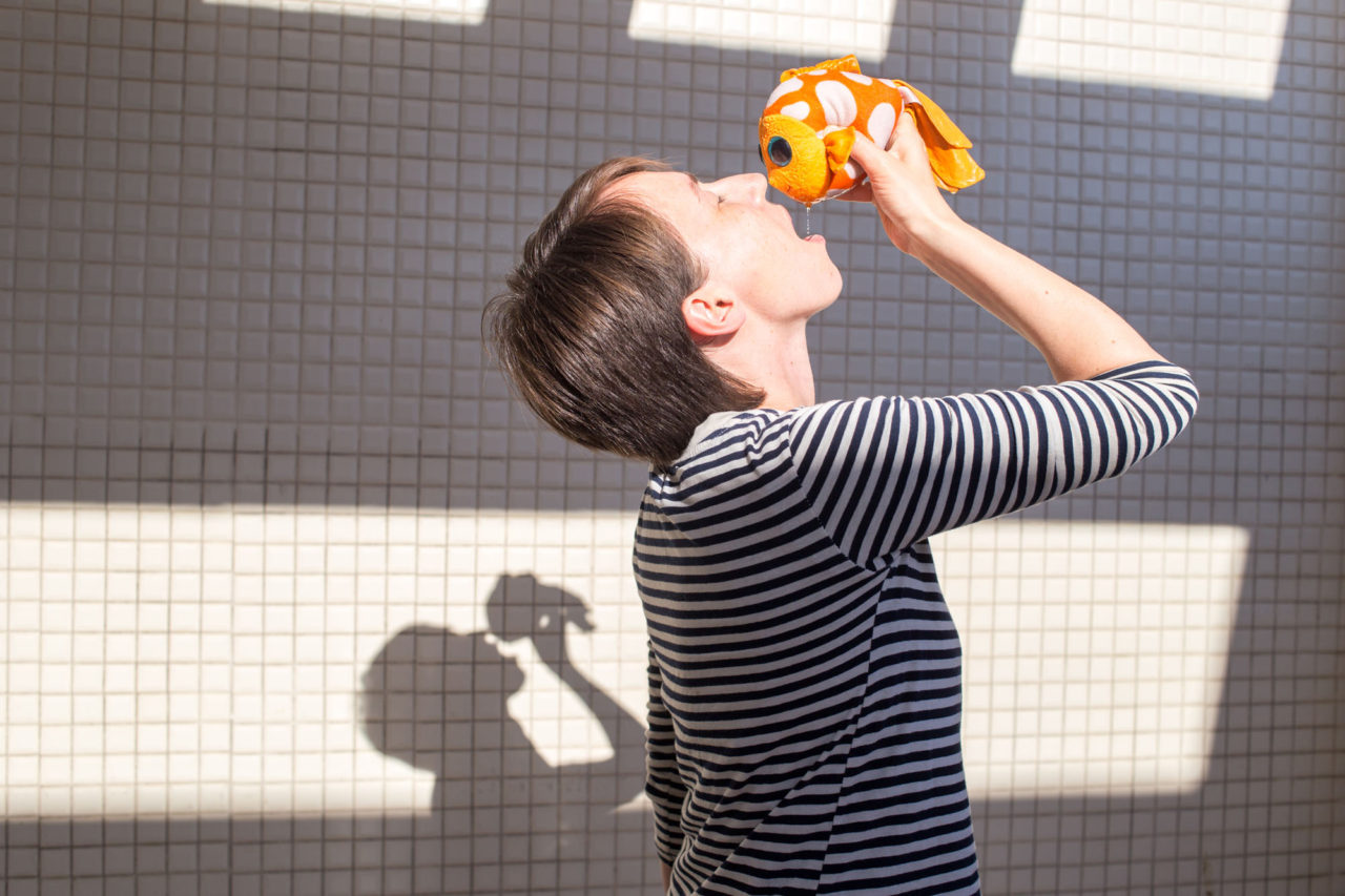 Дочка придумала свой способ пить воду. Она отмачивает плюшевую рыбу в тазу, а затем выжимает из нее водуФото: Анна Резников