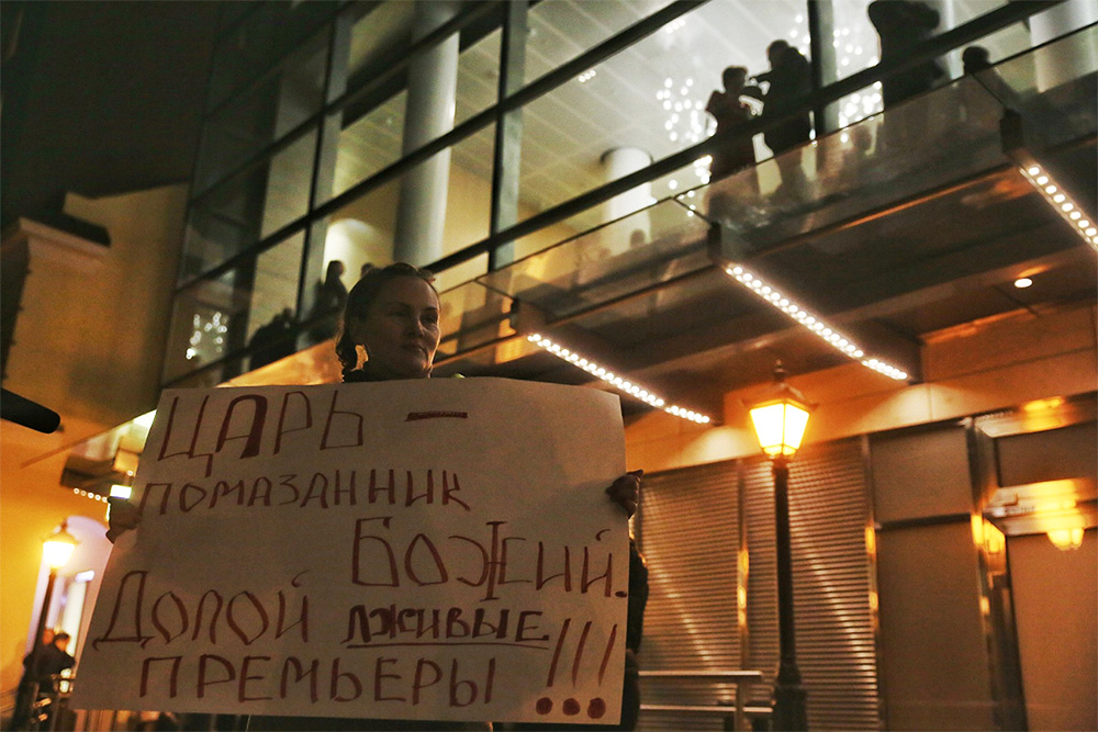 В Мариинском театре 23 октября проходит премьера фильма Алексея Учителя «Матильда». Перед началом сеанса у здания театра на молитвенное стояние собрались противники картины, они пели «Боже, царя храни», псалмы, держали в руках иконы и плакаты с лозунгами против киноленты.