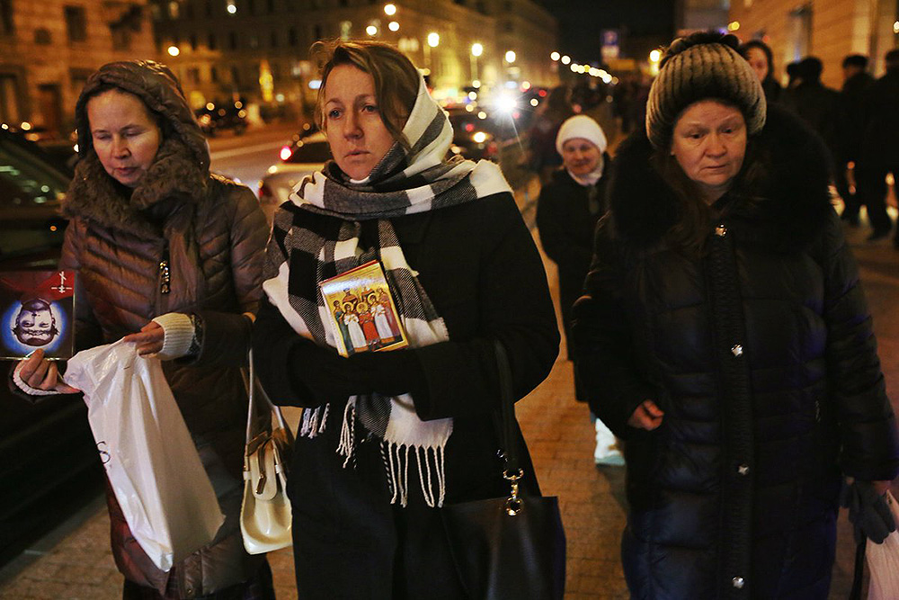 Православные стоят у Мариинского театра перед премьерой «Матильды». Три фото