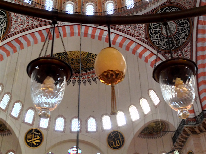 Кстати, на праздничные службы мечеть вмещает до 8000 человек. Есть в Сулеймание ещё два интересных нюанса. Первый: между светильниками висят отполированные страусиные яйца. Они предназначены для того.... чтобы пауки поскальзывались и не плели паутину между светильниками.