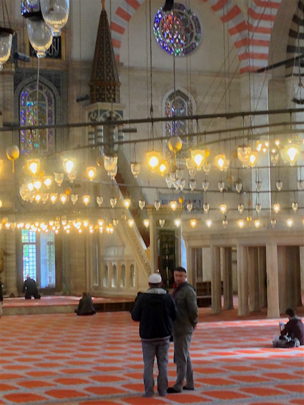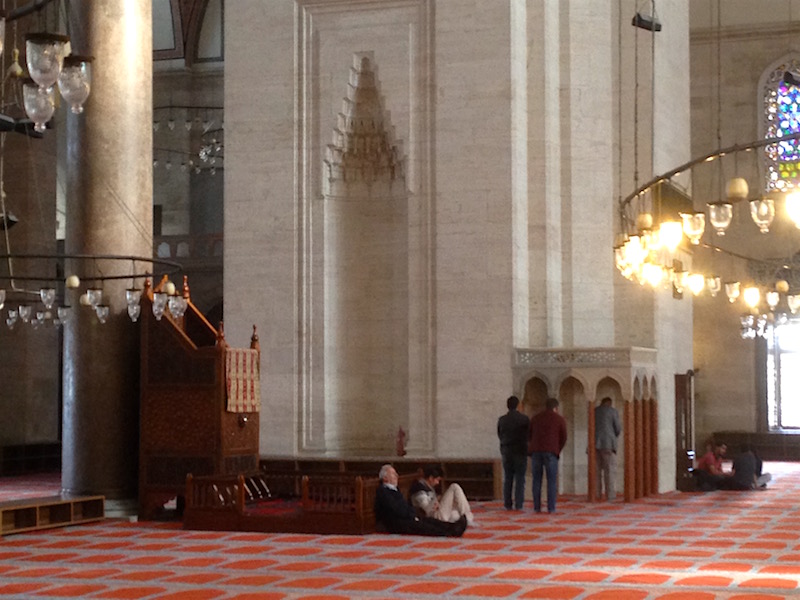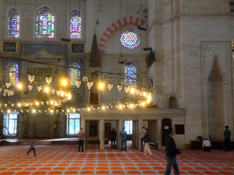 После призыва к намазу (молитве) с минарета, муэдзин (не путать с муллой) приходит в мечеть, встаёт на махфиль и вторично призывает мусульман к молитве. Прихожане выстраиваются в ряды, плечом к плечу, и муэдзин произносит формулы восхваления Аллаха, которы он и прихожане повторяют 33 раза. Этот процесс называется табихат. В Сулеймание есть махфиль для султана - чтобы во время молитв на него не было совершено покушение, но султан, в тоже время, молился вместе с прихожанами. На фото левее махфиля (в центре стены, обращённый в сторону Каабы) находится михраб. Вот другой михраб из этой же мечети.