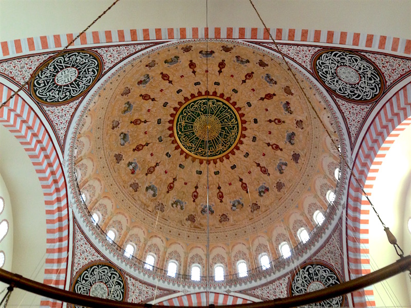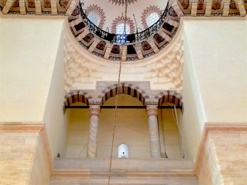 Арабская вязь в центре центре купола не случайна, как вы понимаете. Это аят Корана, который гласит: "Воистину, Аллах удерживает небеса и землю, чтобы они не сдвинулись. А если они сдвинутся, то никто другой после Него их уже не удержит. Воистину, Он - Выдержанный, Прощающий". Этот аят нанесён на "килит таши" - замковый камень, удерживающий весь свод. Проблема больших куполов - в их весе, который приходится удерживать и в форме, которая собирает звуки в себя и гасит их. Синан решил две эти проблемы одним нюансом: в куполе встроено множество... кувшинов, которые облегчают вес купола и являются резонаторами, помогая распространению звука. Сооружение с колоннами - махфиль.