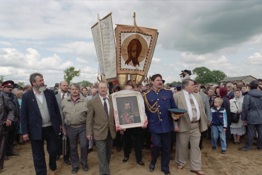 Россия. Московская область. 27 мая 1996 г. Церемония открытия памятника Николаю II в подмосковном селе ТайнинскомФото: Виктор Великжанин/ТАСС «Мы встретились на автобусной остановке, — вспоминает исследователь. — Активисты раздали нам иконы с Николаем II, Григорием Распутиным и некоторыми святыми, имперские и сербские флаги, а также самодельные хоругви, прикрепленные на ручки от швабры. Под пение «Боже, царя храни» мы двинулись в сторону памятника, три раза обошли его. После краткой проповеди прочитали акафист царю-искупителю, потом чин всенародного покаяния, включающий список соборных грехов русского народа, главный из которых: цареубийство. После каждого греха молящиеся восклицали: «Прости нас, милосердный Господи!» Потом люди начали обмениваться пророчествами, рассказами о своих паломнических поездках, дисками об отроке Вячеславе».