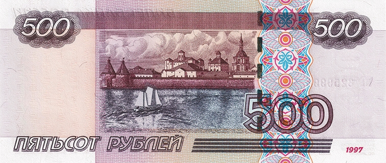2. «Мало кто знает, что на современной 500-рублевой купюре изображен Соловецкий монастырь. Посмотрите внимательно на купюру. И пусть на ней стоит дата: 1997 год — не верьте, так выглядел монастырь в 1975 году (у меня есть документальное подтверждение этого факта) (Митин И. В. Соловки и физфак. http://upmsu.phys.msu.ru/solovki.htm).