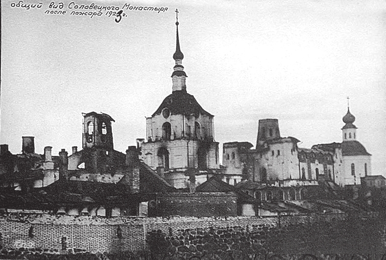 Купола Преображенского собора Соловецкого монастыря были разрушены пожаром в конце мая 1923 года (рис. 1). После превращения Соловков в лагерь (первая партия прибыла туда 7 июня 1923 года) в соборе открыли столовую для заключенных. Над башенками сделали шатровую крышу из рубероида, хотя над колокольней еще был крест.