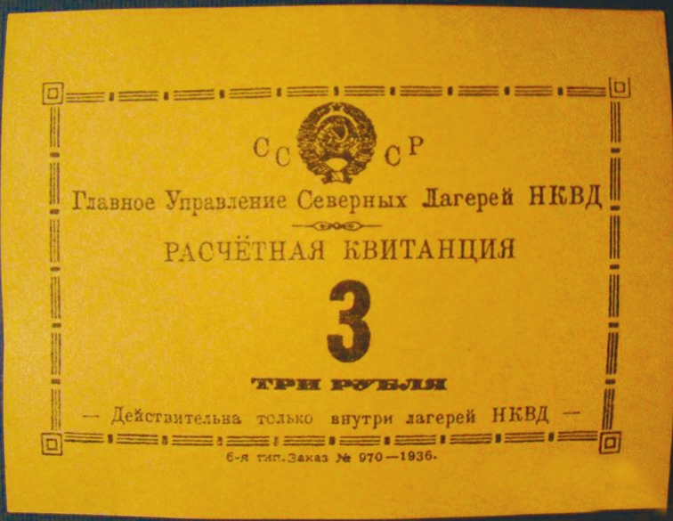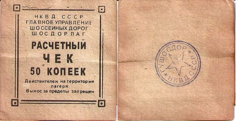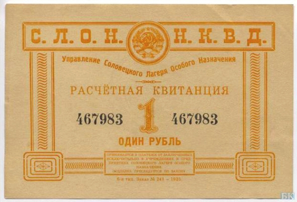 СЛОН (Соловецкий лагерь особого назначения) был микромиром с собственными газетами, журналом «Соловецкие острова», который рассылался по библиотекам всей страны, музеями, научными лабораториями, даже партийными фракциями и церковным «собором соловецких епископов» [6]. Были в нем и свои деньги, которые можно было заработать (5–6 руб. в месяц за перевыполнение нормы); основным же их источником были переводы с материка (до 50 руб.): наличные заключенным не выдавали, чтобы затруднить побег, а заменяли их на расчетные квитанции (рис. 12–15). На боны лагерей особого назначения (т. е. собственно Соловков) ставили дату «1929 год»; а на боны исправительно-трудовых лагерей, структуры, выросшей из Соловков и поглотившей их (ГУЛаг был основан в 1930 году), — «1932 год». Минимальным номиналом были 2 копейки (рис. 12), максимальным — 5 руб. (рис. 13); каталоги упоминают бону 1932 года номиналом 10 руб., но ее изображение найти не удалось. На 5 руб. можно было купить 2 кг колбасы, чуть меньше 4 кг селедки, чуть больше 8 кг сахара, 27 английских булавок.