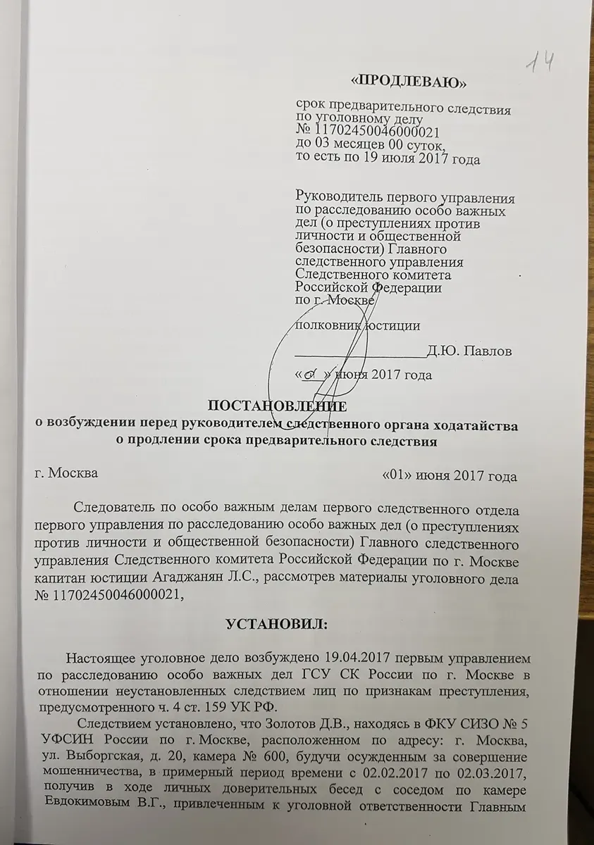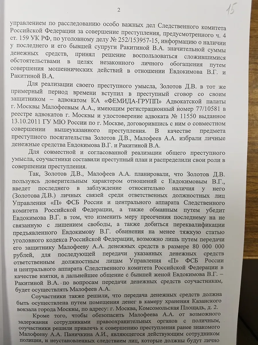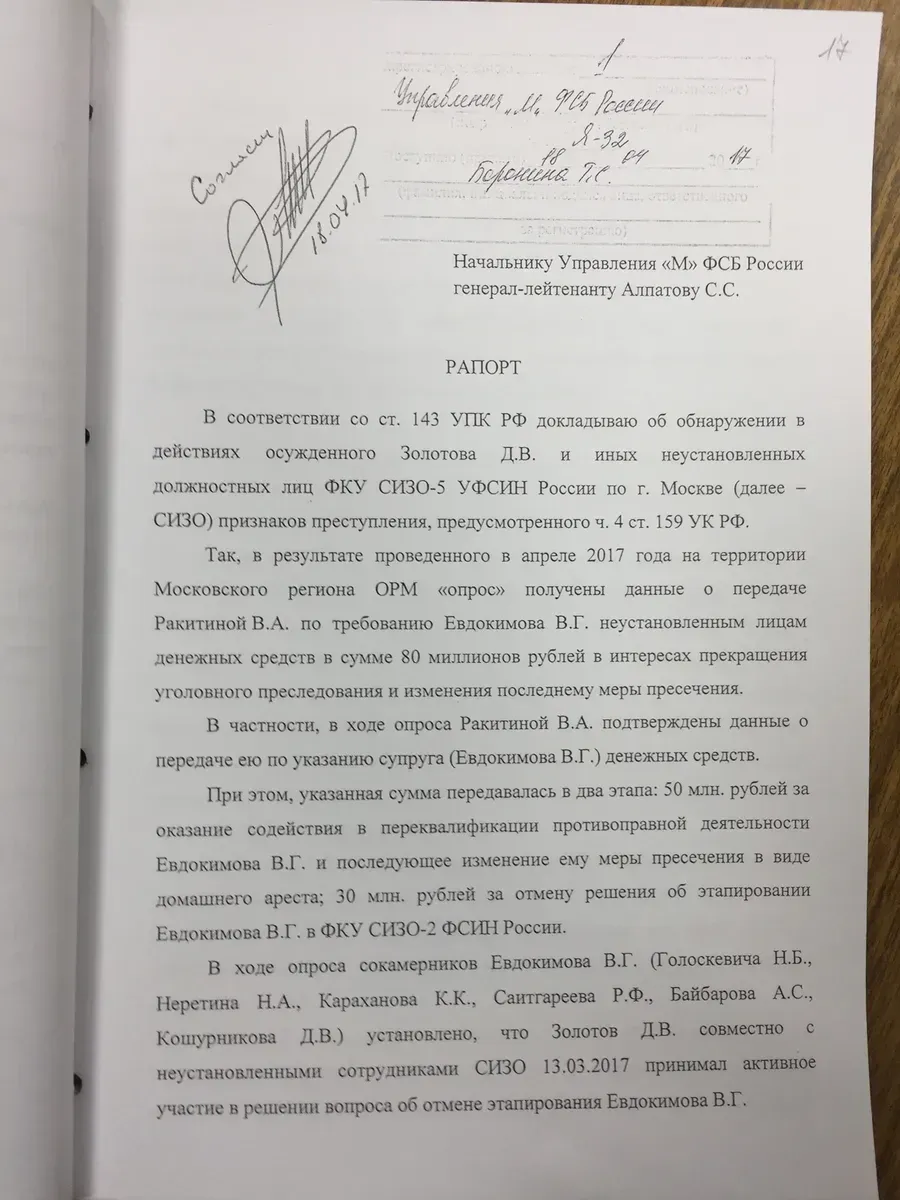 Он сказал, что перед ним лежит бумага о его переводе за подписью некоего сотрудника Управления «П» СЭБ ФСБ Хотюна (заместитель начальника Управления «П» СЭБ ФСБ. — А. С.) <…> Со слов Евдокимова, Денис (Дионисий) сказал, что при расчете 50 млн рублей забыли заложить долю сотрудников Управления «П» СЭБ ФСБ, которые курируют уголовное дело в отношении Евдокимова».