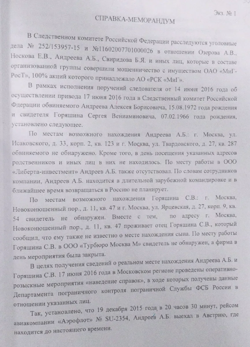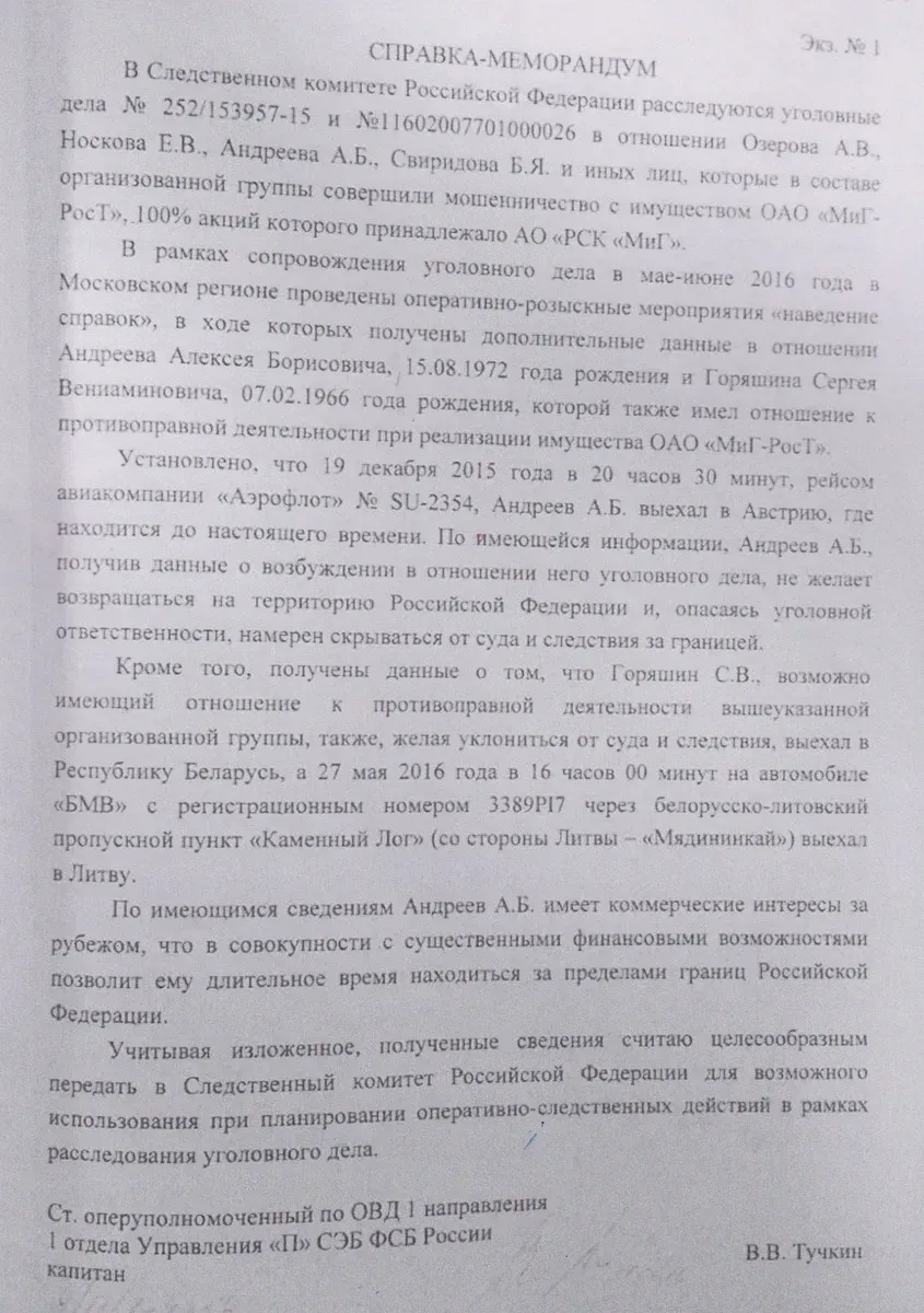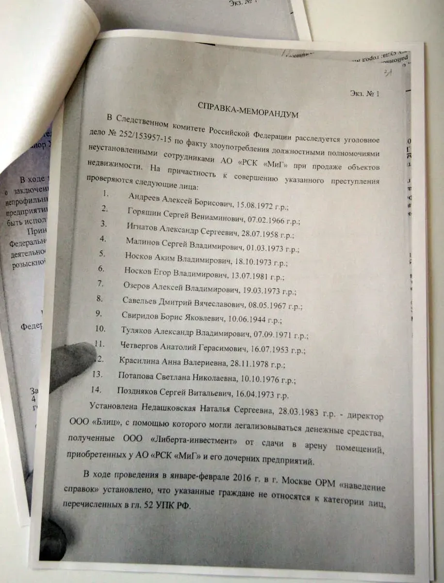 В середине июня 2016 года оперативники Управления «П» СЭБ ФСБ при поддержке бойцов спецназа ФСБ произвели веерные обыски по 20 адресам бывших руководителей РСК «МиГ» в рамках уголовного дела о хищении имущественного комплекса.