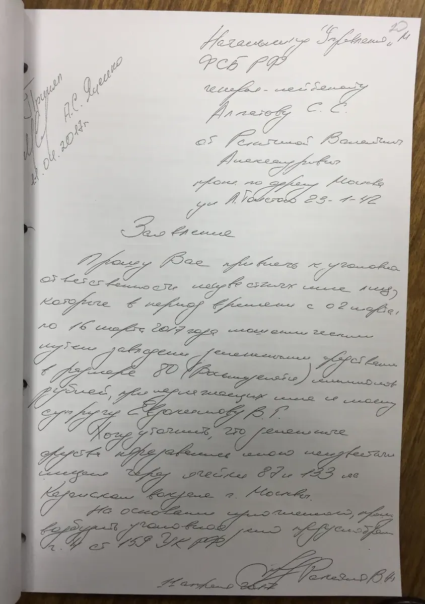 На первом листе записки был отражен план реструктуризации уголовного дела <…> с последующим изменением меры пресечения на домашний арест и прекращением дела за истечением срока давности. На втором листе была инструкция по передаче денежных средств: 50 млн рублей в долларах по курсу 58 (863 тысячи долларов США),