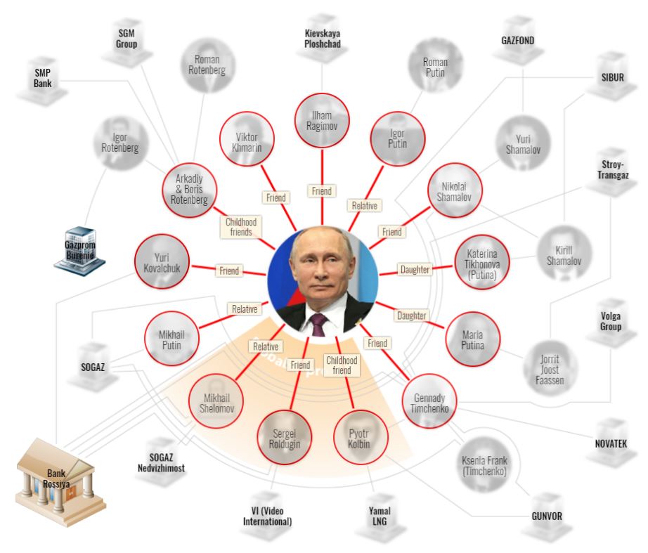Авторы доклада OCCRP также включили в "личный круг" российского лидера других его родственников и крупных бизнесменов, которых в средствах массовой информации неоднократно называли "друзьями Путина". В список, в частности, вошли Николай и Юрий Шамаловы, Игорь, Роман и Михаил Путины, а также Борис и Аркадий Ротенберги. В расследовании подчеркивается, что наиболее успешные бизнесы предпринимателей из "личного круга" связаны с крупными государственными предприятиями, в том числе нефтегазовыми.