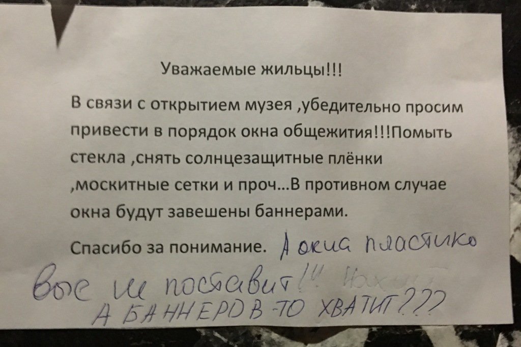 Жильцов общежития в Новосибирске попросили помыть окна и снять москитные сетки. В противном случае здание обещают закрыть баннером. Люди недовольны и связывают это с возможным приездом Путина на открытие патриотического музея "Россия. Моя история", появившегося напротив их дома. Фото объявления, появившегося в подъезде, жители прислали в редакцию Тайги.инфо